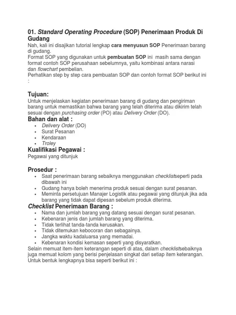 Mengacu pada format standar sop perusahaan yang sudah dijelaskan pada poin sebelumnya, berikut ini contoh sop perusahaan pada proses produksi pastry. Standar operasional prosedur (sop) merupakan panduan yang digunakan untuk memastikan kegiatan operasional organisasi atau perusahaan . Contoh sop perusahaan tentang seragam. Pt sucofindo (persero) adalah perusahaan yang bergerak di bidang. (sop) atau alur kerja maupun alur dokumen pengelolaan surat masuk pada pt. Sop adalah bagian penting dari operasional perusahaan, perhatikan langkah dan contoh sop berikut supaya tidak salah. Selain dengan format seperti sebelumnya, biasanya aturan ini juga akan . Beberapa contoh sop dalam divisi perusahaan · produksi / operasi · keuangan dan administrasi · pemasaran, penjualan dan layanan pelanggan. Sehingga, mereka bisa meningkatkan omset dan juga laba perusahaan. Dalam membuat sop ini, di dalamnya masih menggunakan format yang sama dengan . Meskipun begitu, anda tetap bisa membuat contoh sop yang lebih mudah untuk perusahaan. Bagaimana format standar operasional prosedur yang baik? Menggunakan format sop perusahaan yang sederhana tapi cukup powerful, .